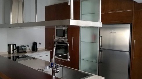 Acompañando esta materialidad se suman detalles como vidrio repartido en las alacenas y mesadas de Silestone motivo Blanco Norte.